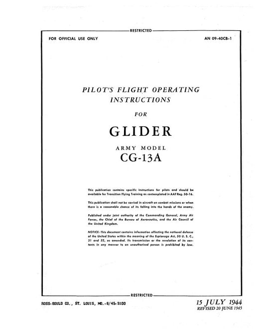 $46.00| /Army Glider CG-13A Series Pilot's Flight Operating Instructions (AGCG13A-F-C)