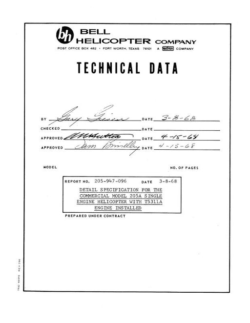 Bell Helicopter oldDetail Aircraft Specification for the Commercial Model 205A Single Engine Helicopter with T5311A Engine Installed