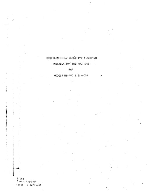 Brittain IndustriesHi-Lo Sensitivity Adapter Models BI-400, BI-400A - Dated 4-10-65 11961