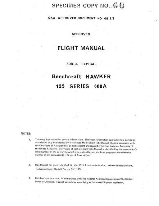 $89.00| /DeHavilland Beechcraft Hawker 125 SER 600A Flight Manual (DEHS125600A-F-C)