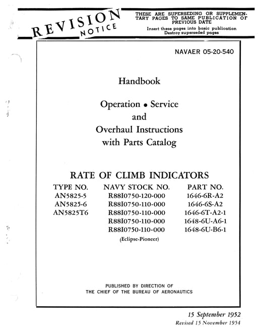 $17.00| /Eclipse-Pioneer Rate of Climb Indicators 1647-1AM-A1-1 Service, Overhaul, Parts 05-20-541