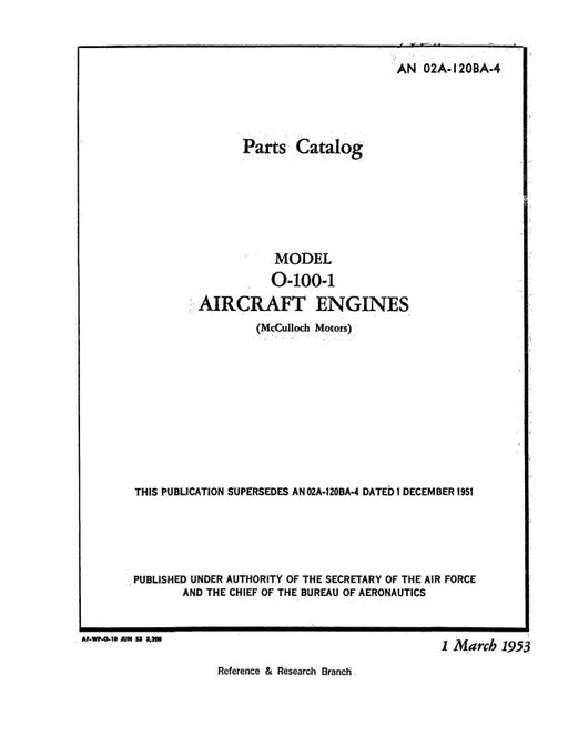 $15.00| /McCulloch Motors O-100-1 Aircraft Engine 1953 Parts Catalog (02A-120BA-4)