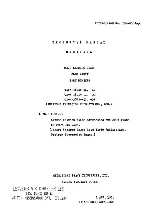 $35.00| /Mitsubishi Heavy Industries Main Landing Gear 1968 Overhaul Manual (YET-68080A)