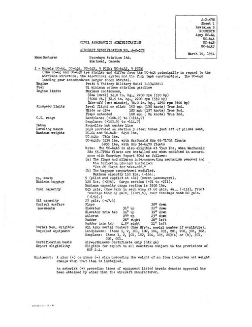 $9.00| /Noorduyn Aviation UC-64,-64A,B,AS 1954 Aircraft Specification (SPEC.-NO.-A-2-5)